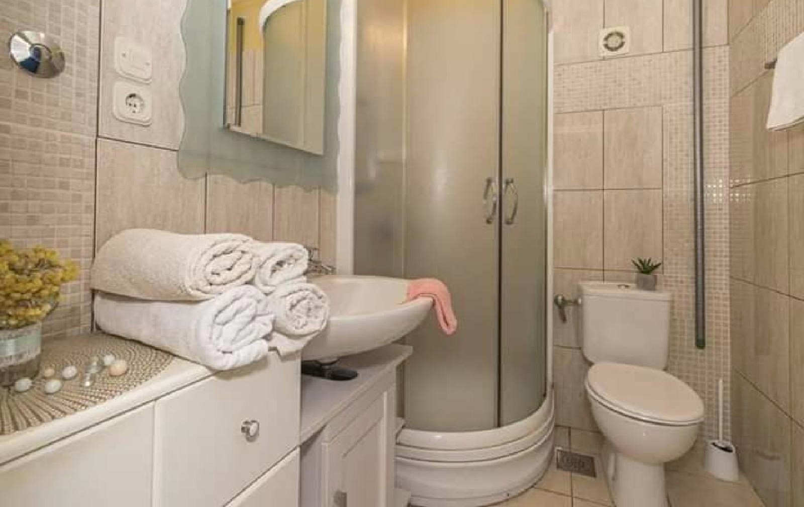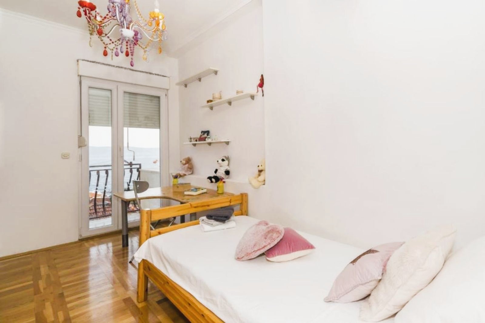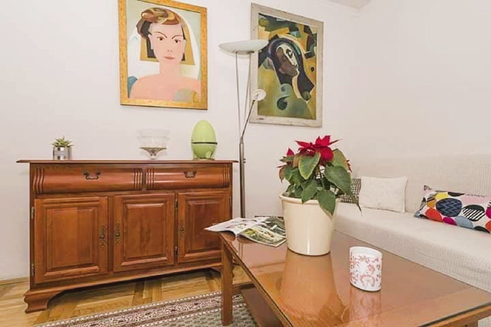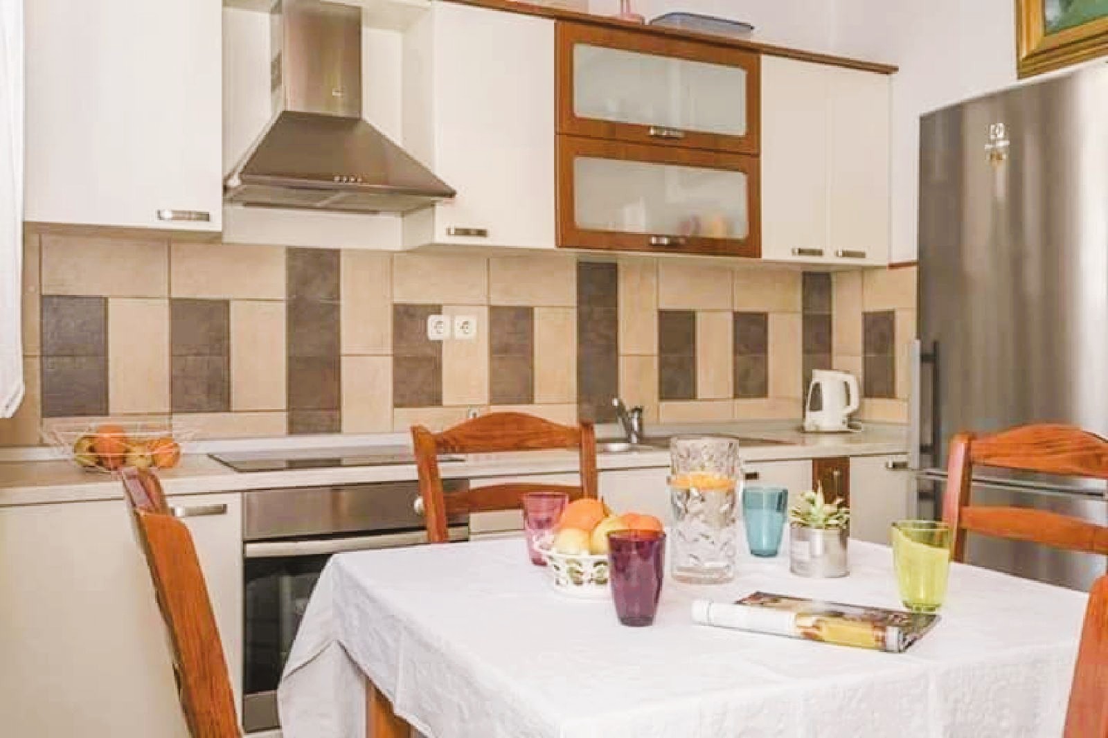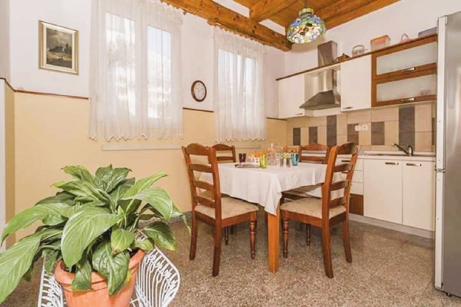 A comfortable three bedroom apartment with an interior area of 145.56 m2 with two covered terraces (total of 12.13 m2), a balcony of 31 m2 and a garage of 12 m2, converted into two smaller flats/apartments, with a nice view of the sea, fully facing south, sunny, approx. 300 meters from the sea and a pebble beach, completely furnished and equipped, on the 1st floor of a private house (ground floor at the back).