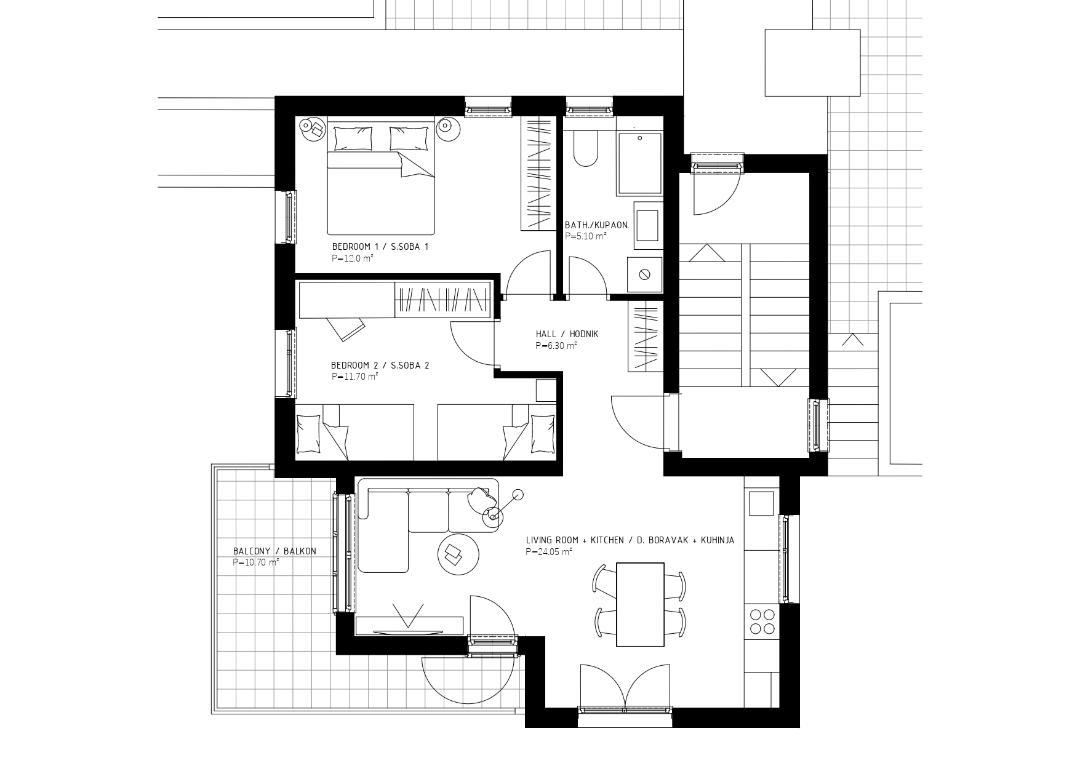 Two bedroom apartment of 65 m2, located on the 2nd floor of a smaller residential building under construction (completion of the construction is planned for the summer 2026), in a quiet location in Komiža on the island of Vis, parking spot, consisting of two bedrooms, hallway, bathroom, kitchen with dining and living area and balcony with a fantastic sea view, sunny and bright.