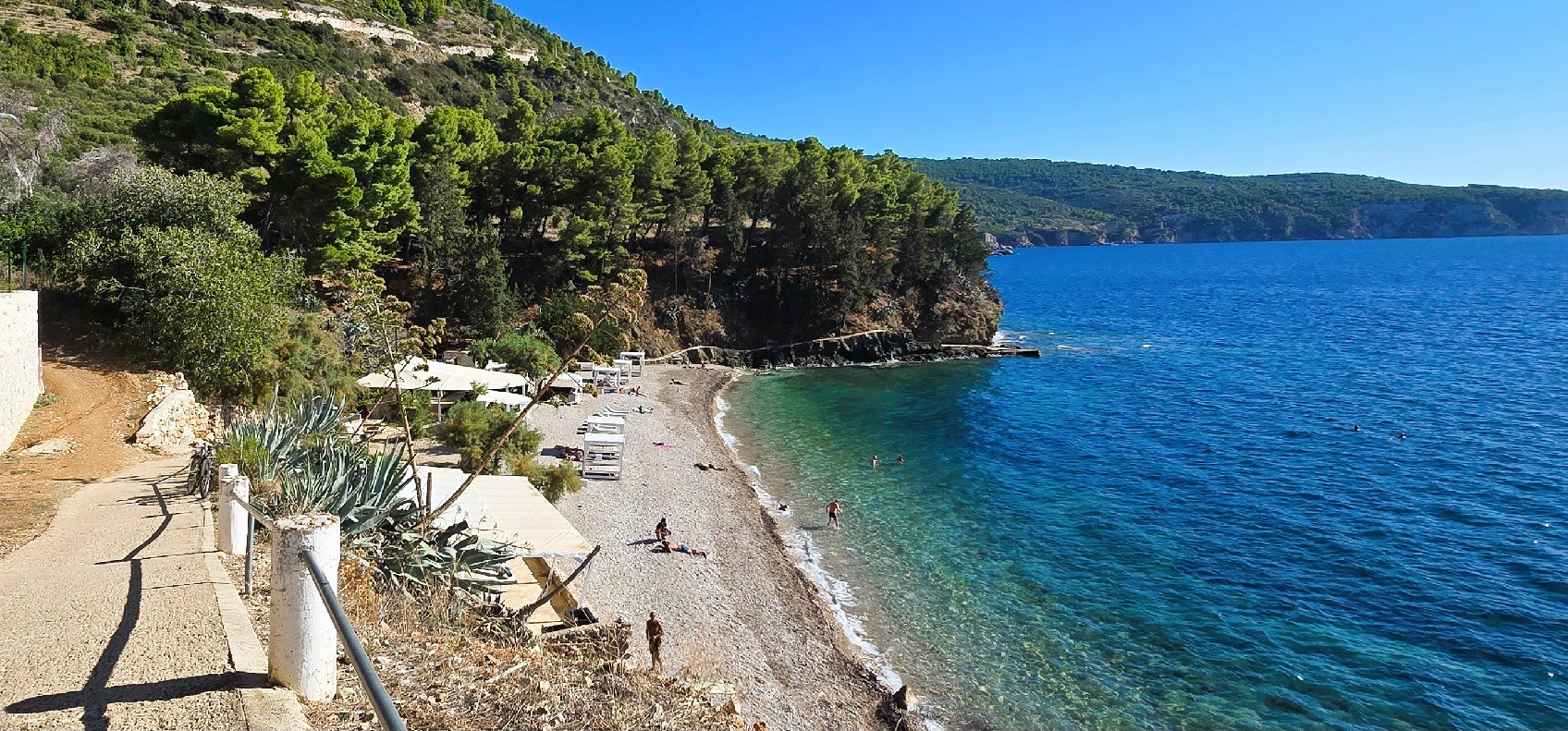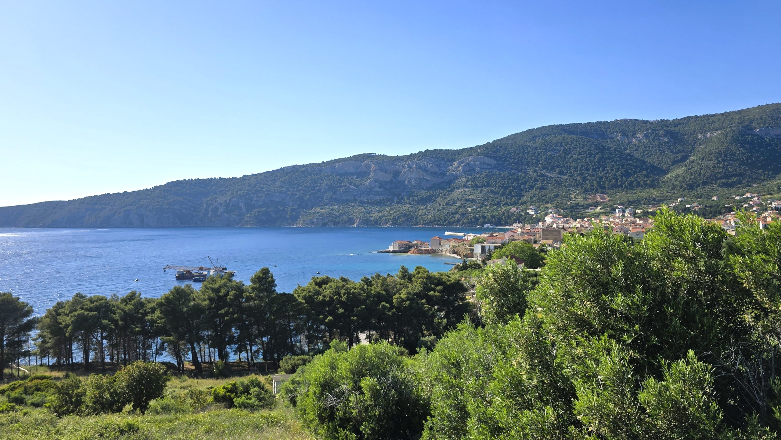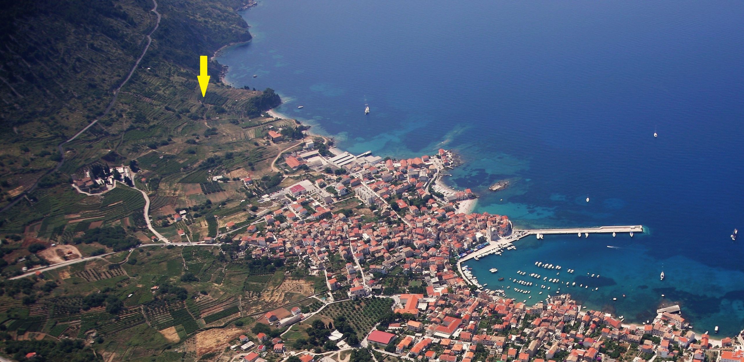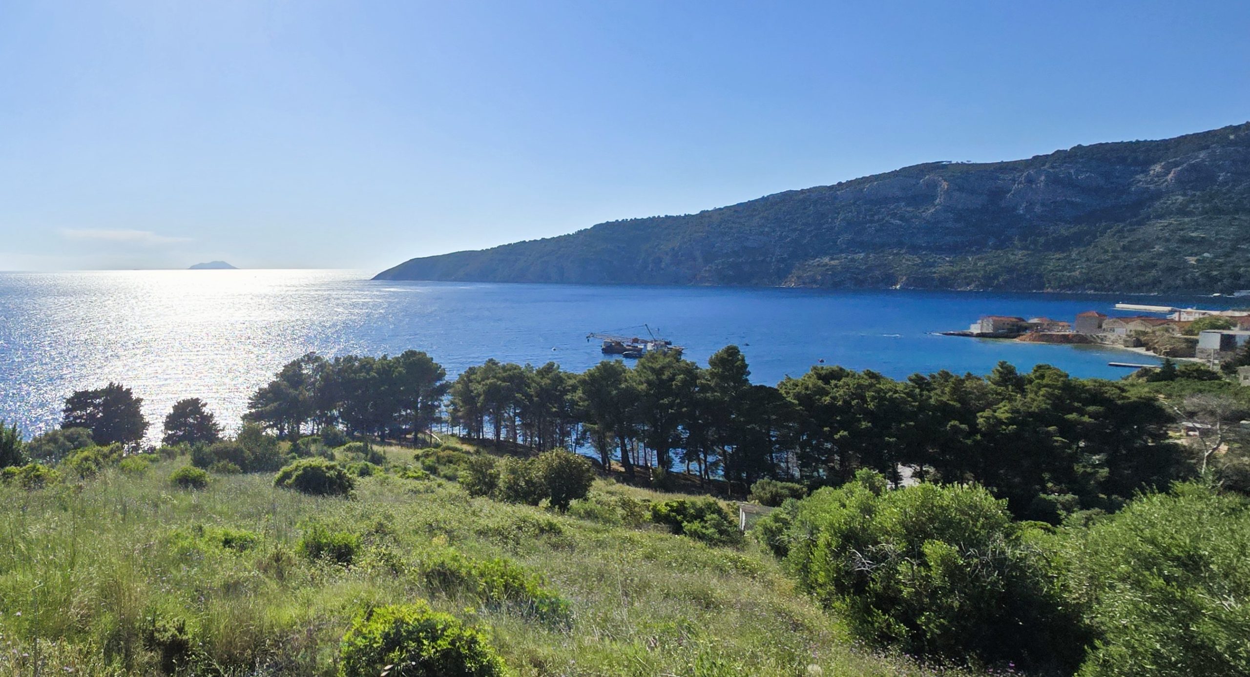 A one-story house of 20 m2, on a plot of land of 4,000 m2 - an olive grove with 150 olive trees, in a beautiful location above Kamenice beach, entirely in the T3 (camping) zone, fantastic view of the sea and Biševo, with only a pedestrian path, currently no construction is possible, the existing building is legalized - mixed use,