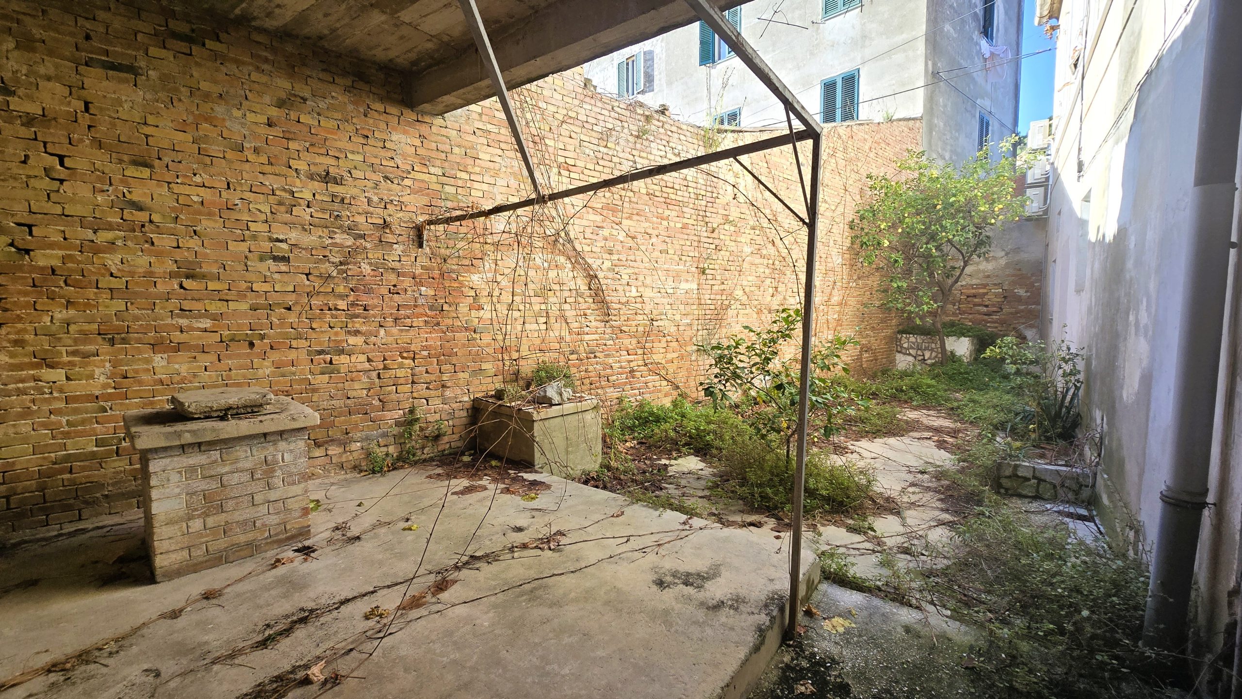 - ground floor: courtyard, covered terrace, 2 entrance halls, staircases, several storage rooms and potential business premises;