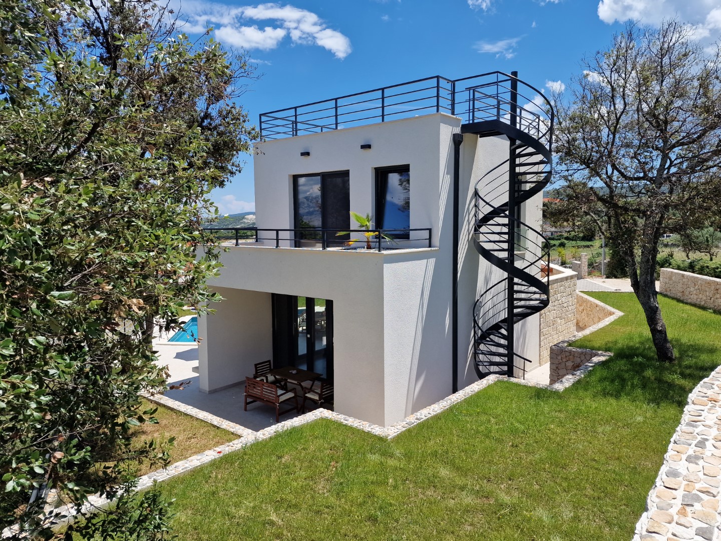 Nova dvoetažna vila površine 140 m2, smještena na rubu prekrasnog sela na sjevernoj strani otoka Brača, cca 3 km od mora, na zemljištu površine 565 m2, koja se sastoji od velikog dnevnog prostora s kuhinjom i blagovaonicom te kupaonicom u prizemlju (60 m2), s velikim staklenim stijenkama koje povezuju unutrašnji i vanjski prostor - popločanu terasu s bazenom površine 32 m2, unutrašnjih stepenica koje vode na kat, dvije prostrane sobe sa walk in ormarima i izlazima na zasebnu terasu i kupaonice na katu, te krovne terase površine 50 m2, građena vrlo kvalitetnim materijalima, potpuno namještena i opremljena, ograđena ručno klesanim kamenim zidovima, idealna za stanovanje, odmor ili turistički najam.
