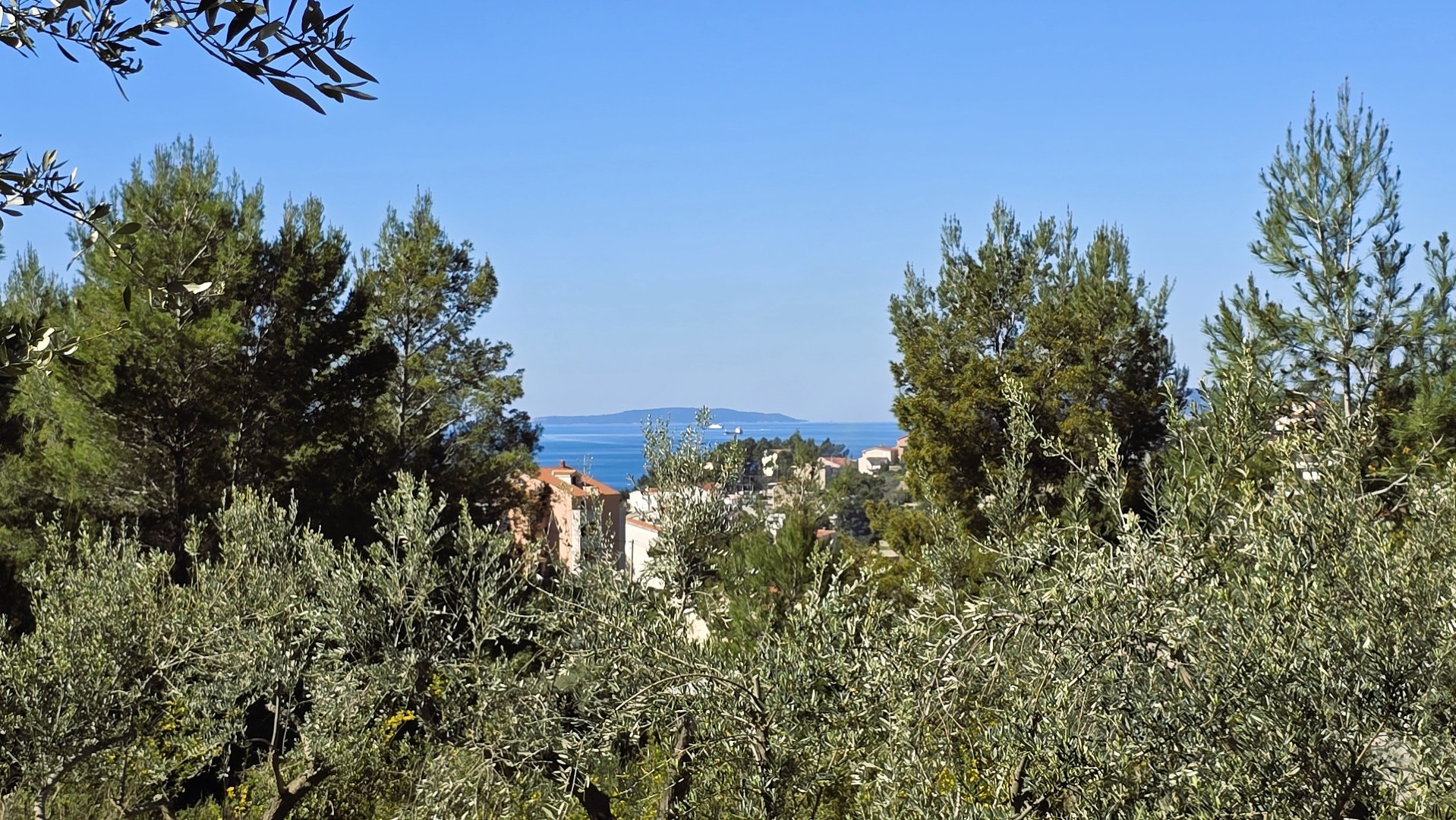 Građevinsko zemljište površine 1.050 m2, smješteno na mirnoj lokaciji u Podstrani cca 700 metara od mora i plaže, u lijepom okruženju, s djelomičnim pogledom na more (jugozapad), prilaz autom, priključci vode i struje u blizini.